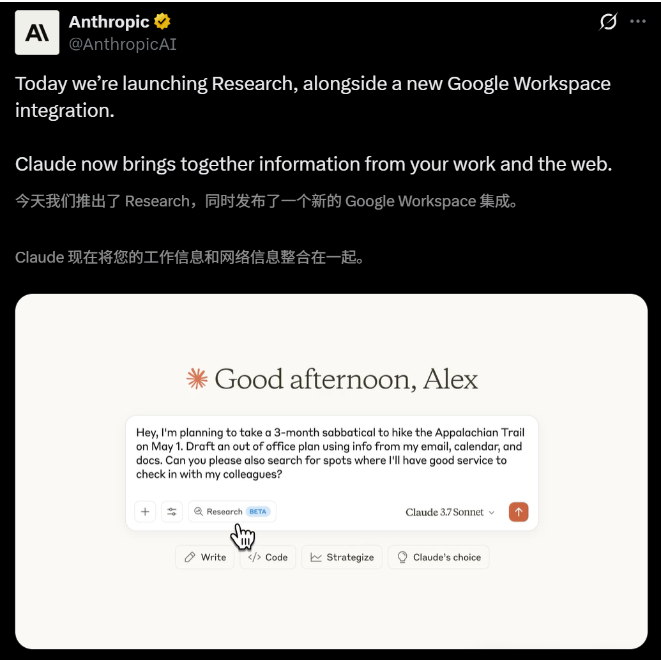 Claude推出Research功能与Google Workspace集成,工作效率大幅提升