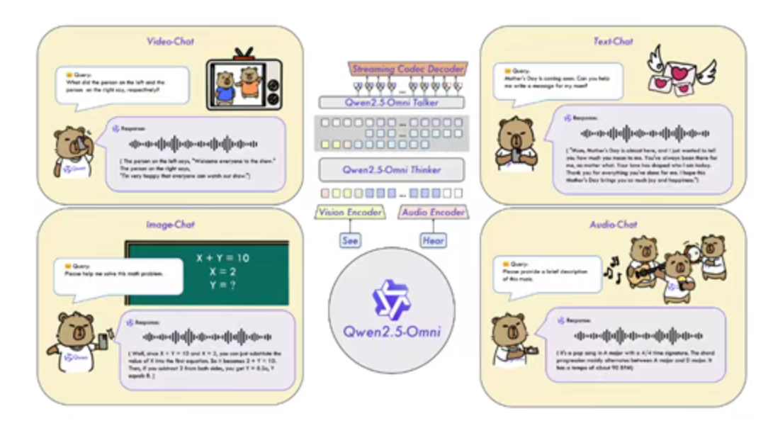 - 采用创新的“Thinker-Talker”架构,通过时间对齐多模态 RoPE(Rotary Position Embedding)技术,实现视频与音频输入的高效同步。