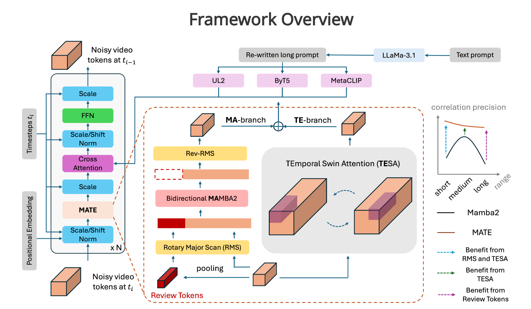 - 双分支架构:MA分支和TE分支分别处理短、中、长范围的相关性,提高生成视频的一致性和质量。