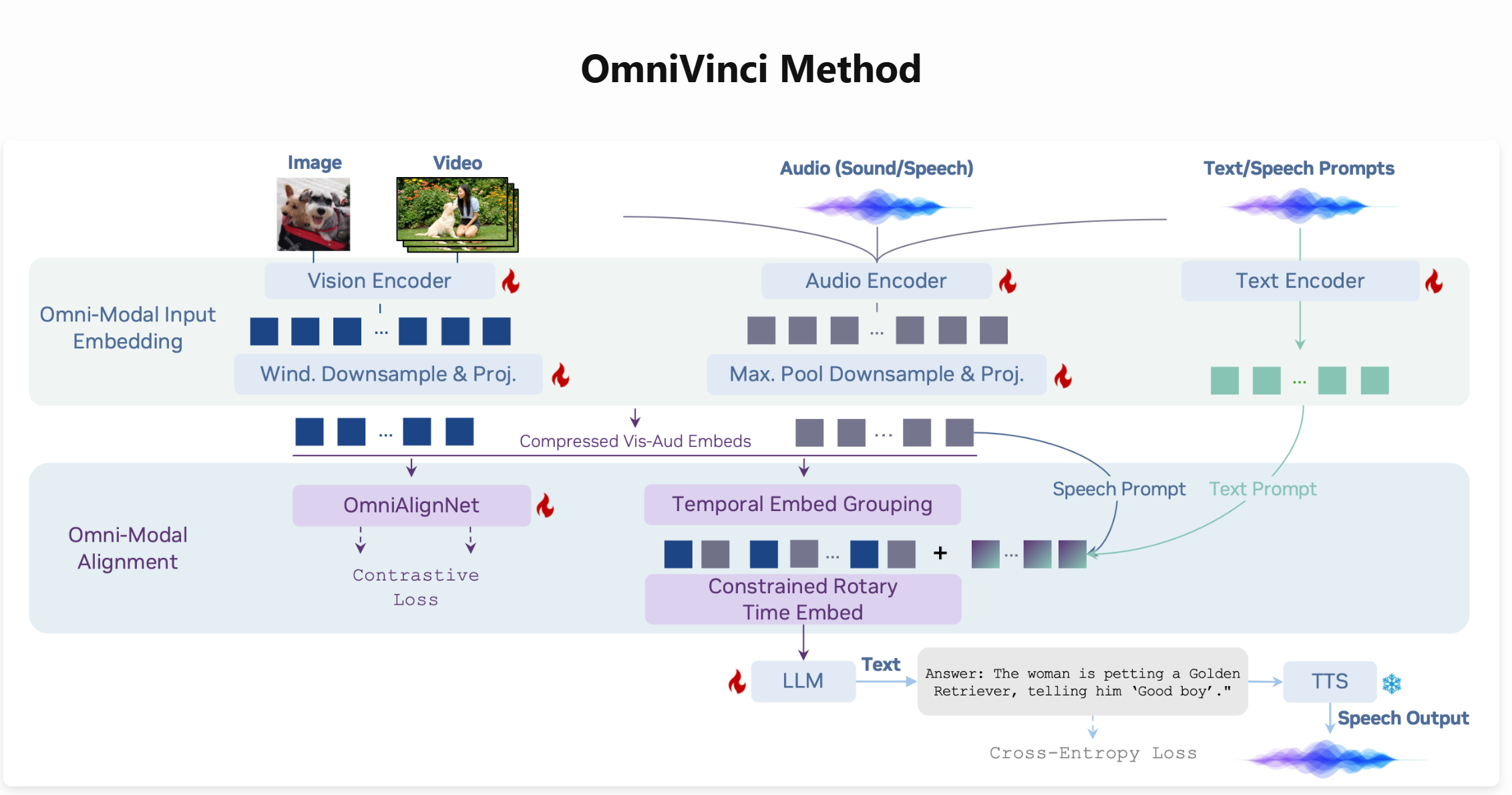 OmniVinci采用自回归架构编码视觉和音频信号,将其对齐后输入LLM骨干网络。关键技术包括: