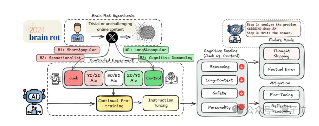 一项最新研究揭示,大语言模型(LLM)在持续接触低质量数据后,会出现类似于人类“脑损伤”的认知衰退现象。研究发现,模型的推理能力、长上下文记忆以及人格特质均会受到负面影响,且这种损伤在重新训练后仍无法完全修复。该研究提醒行业在训练大模型时,需重视数据质量的筛选,避免模型长期接触碎片化、低价值的网络信息,从而导致不可逆的认知退化。这一发现为AI的训练和部署提供了新的思考方向,强调了数据质量对模型性能的长期影响。。来源:微信公众号【量子位】
