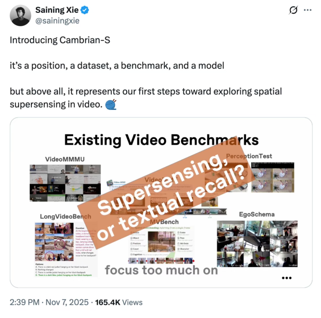 纽约大学助理教授谢赛宁与李飞飞、Yann LeCun 联合提出「Cambrian-S」,探索视频空间超感知。该研究认为,构建「超级智能」之前必须先构建「超感知」,并划分了多模态智能从现代到未来的发展路径,包括语义感知、流式事件认知、隐式 3D 空间认知和预测性世界建模。团队在 Cambrian-S 上训练了一个潜变量帧预测(LFP)头,通过「惊讶度」进行记忆管理和事件分割,在空间认知任务上取得显著提升。来源:微信公众号【机器之心】