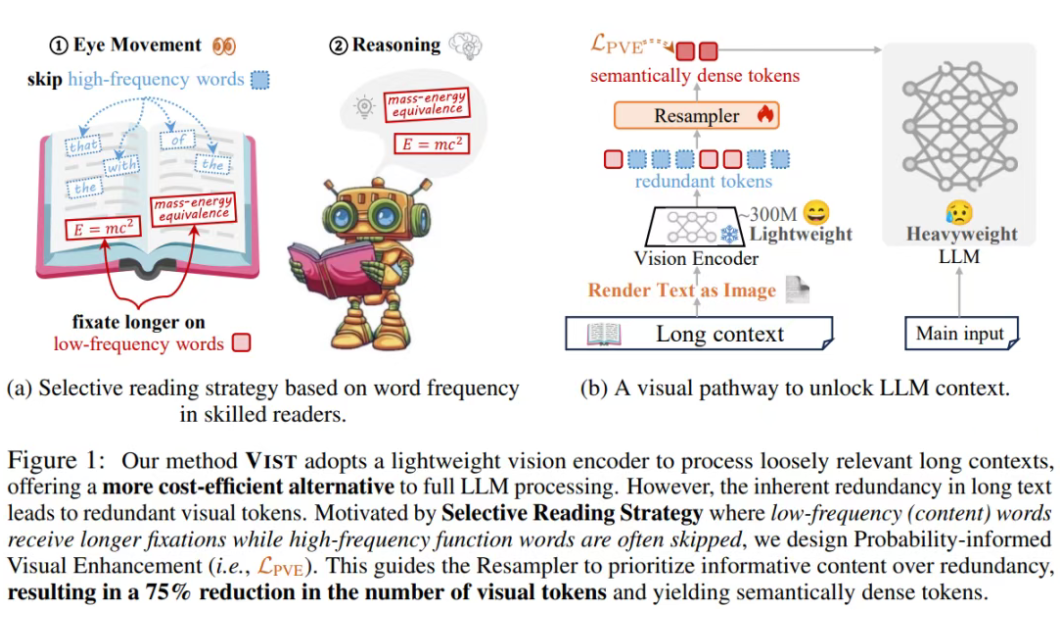 在 NeurIPS 2025 论文中,南京理工大学、中南大学、南京林业大学的研究团队提出 VIST(Vision-centric Token Compression in LLM),为大语言模型的长文本高效推理提供视觉解决方案。VIST 模仿人类「快 – 慢阅读通路」的视觉化压缩机制,通过快路径将远处、次要上下文渲染为图像,由轻量级视觉编码器提取显著性语义;慢路径则将关键近处文本直接输入 LLM 进行深层推理与语言生成。该设计让模型具备「像人一样速读」的能力,处理相同文本内容时所需视觉 Token 数量仅为传统文本分词所需 Token 数量的 56%,内存减少 50%。来源:微信公众号【机器之心】
