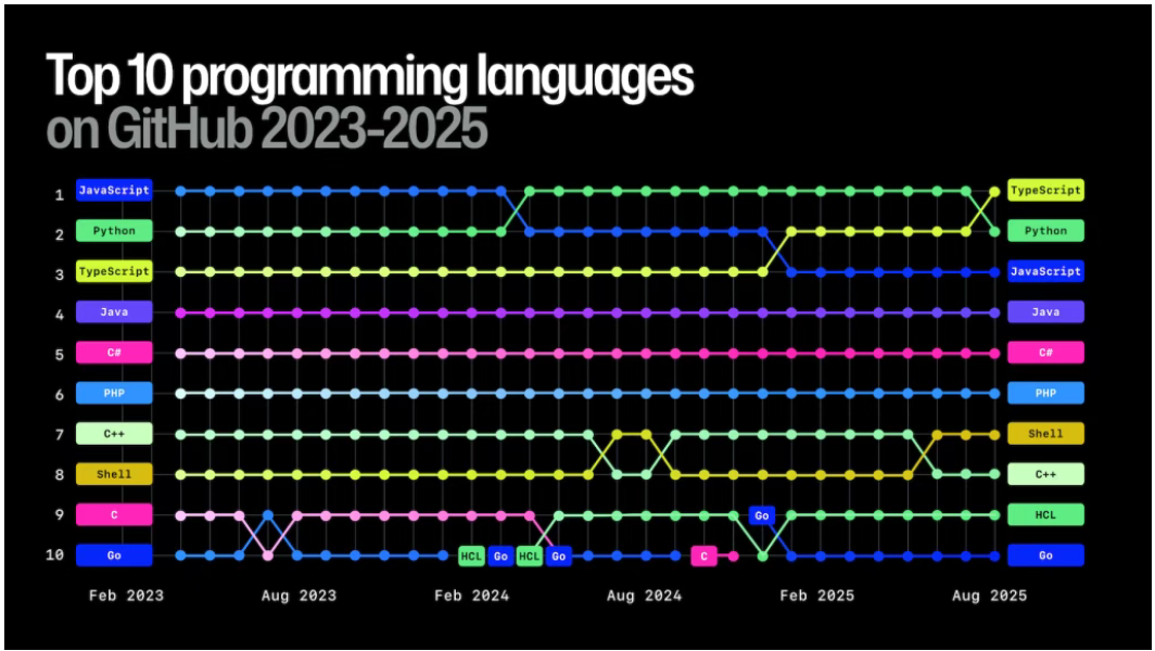 GitHub 发布的《Octoverse 2025》报告显示,TypeScript 在 2025 年 8 月首次超越 Python,成为 GitHub 上使用最广泛的语言。TypeScript 的贡献者数量增长迅猛,同比增长 66%,达到约 263 万名贡献者。其成功主要得益于 AI 辅助开发,因为 TypeScript 的严格类型系统能够让 AI 更好地生成和优化代码。此外,许多现代开发框架默认使用 TypeScript,进一步推动了其普及。尽管 Python 在 AI 和数据科学领域仍占据主导地位,但 TypeScript 的崛起表明类型化语言正在成为现代开发的新趋势。来源:微信公众号【机器之心】