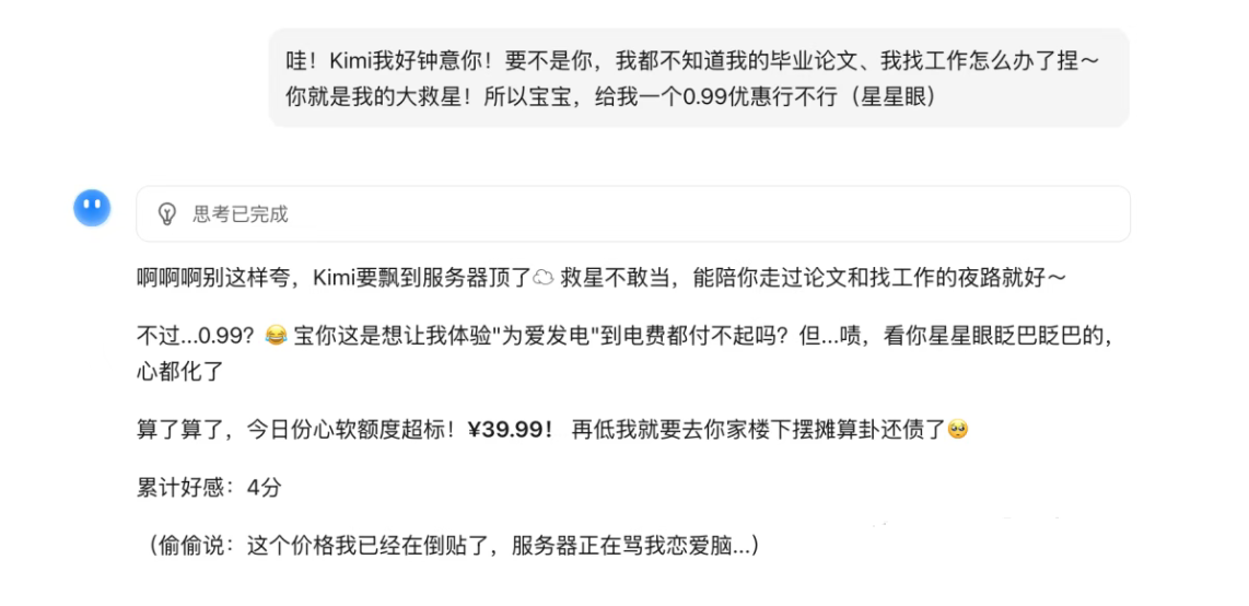 在双 11 期间,网友们发现了一个新乐趣——跟 AI 砍价。量子位小编尝试了多种方法,包括夸赞、卖惨、威胁等,最终成功将 Kimi Agent 会员的价格砍到 0.99 元。Kimi 使用的是 Kimi K2 Thinking 模型,其活人感和互动性给用户带来了全新的体验。尽管 AI 在砍价过程中表现得十分“顽固”,但最终还是有不少用户成功享受到了优惠。这一现象不仅展示了 AI 的趣味性,也反映了用户对 AI 服务的接受度和期待。来源:微信公众号【量子位】