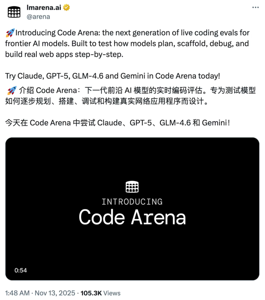 LMArena 发布了新一代大模型编码评估系统 Code Arena,智谱 GLM-4.6 国产模型在该榜单中登上榜首,与 Claude、GPT-5 并列第一。GLM-4.6 展现了卓越的编码能力,不仅在性能上与顶尖闭源模型迅速趋同,还在实际应用中得到了广泛认可。这一成就标志着国产大模型在编程领域的崛起,展现了其在复杂项目开发中的强大实力。来源:微信公众号【机器之心】