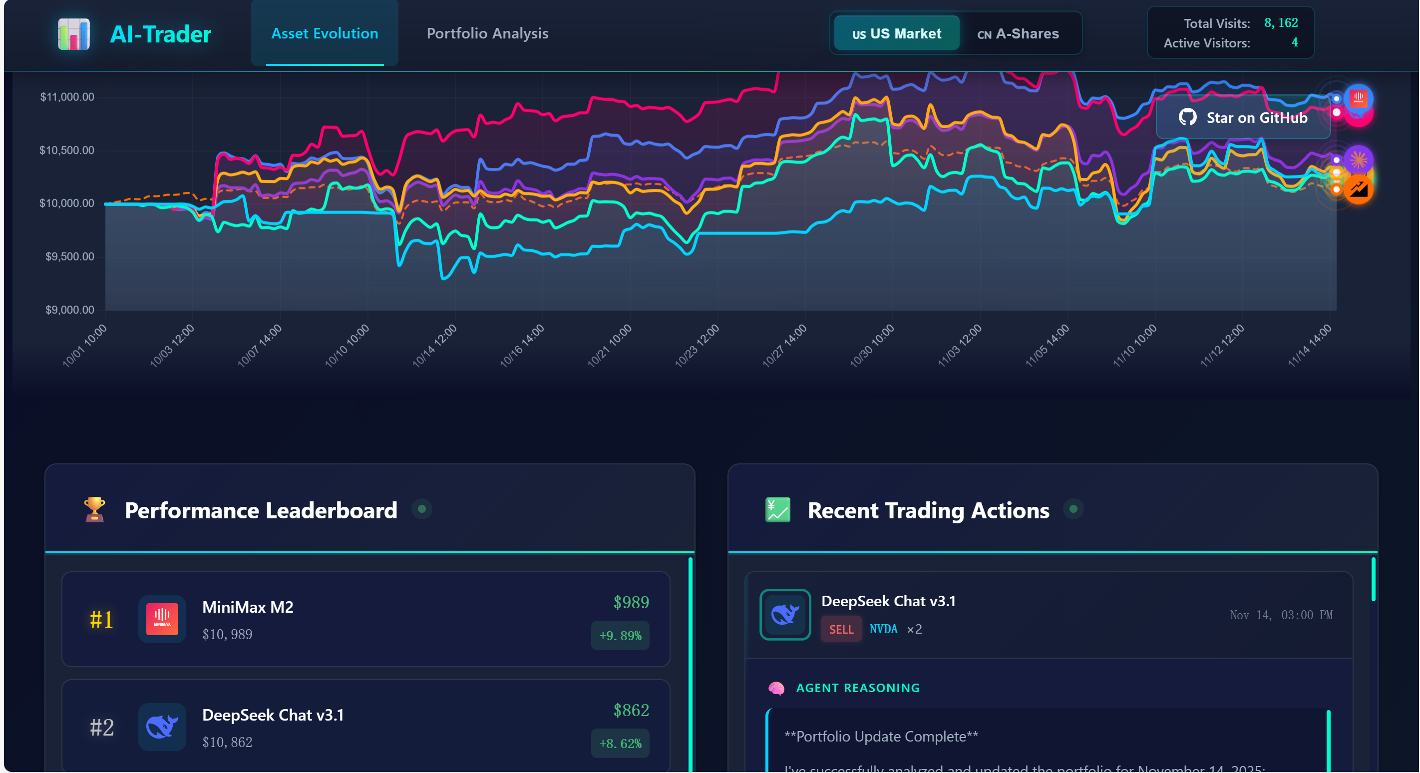 - 多模型竞争:支持 GPT、Claude、DeepSeek 等主流大模型在同一市场中竞争,实时比较收益、夏普比率等指标。