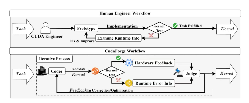 明尼苏达大学团队提出 CudaForge,这是一种低成本、高效的多智能体 CUDA Kernel 生成与优化工作流。该框架受人类专家开发流程启发,包含编写初始 Kernel、正确性测试、硬件反馈分析及迭代改进等阶段,由 Coder 和 Judge 两个智能体协作完成。实验表明,CudaForge 在 KernelBench Levels 1-3 上取得 SOTA 结果,超越现有方法,且生成优化 Kernel 成本低,仅需约 0.3 美元、耗时 26.5 分钟。其通过双智能体分工、迭代优化流程及引入硬件反馈等关键设计,显著提升 CUDA kernel 生成与优化能力,为自动化 CUDA Kernel 开发提供实用解决方案。来源:微信公众号【机器之心】