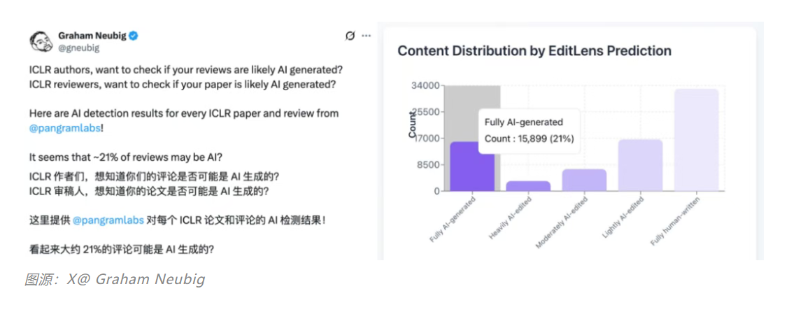 ICLR 2026 审稿意见中 AI 生成现象引发讨论。第三方机构统计发现,在 75800 篇论文审稿意见中,21% 完全由 AI 生成,4% 重度 AI 编辑,9% 中度 AI 编辑,22% 轻度 AI 编辑,仅 43% 完全由人类撰写。AI 审稿意见篇幅更长、更可能给出高分。Pangram Labs 使用 EditLens 模型分析得出此结果,还发现完全由 AI 生成的评审更倾向于给出置信度为 3 的评价。ICLR 2026 官方回应称正在讨论应对措施,建议收到低质量或 LLM 生成评审的作者反馈给领域主席。这一现象反映出 AI 在学术审稿领域的广泛应用及其带来的新问题。来源:微信公众号【机器之心】