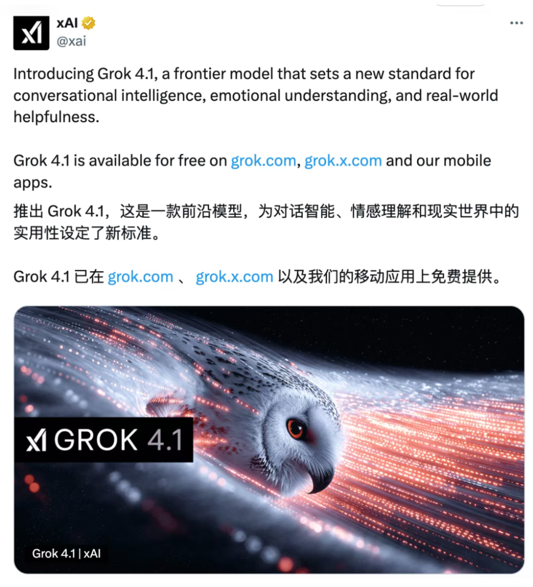 马斯克xAI发布Grok 4.1,通用能力大幅提升
