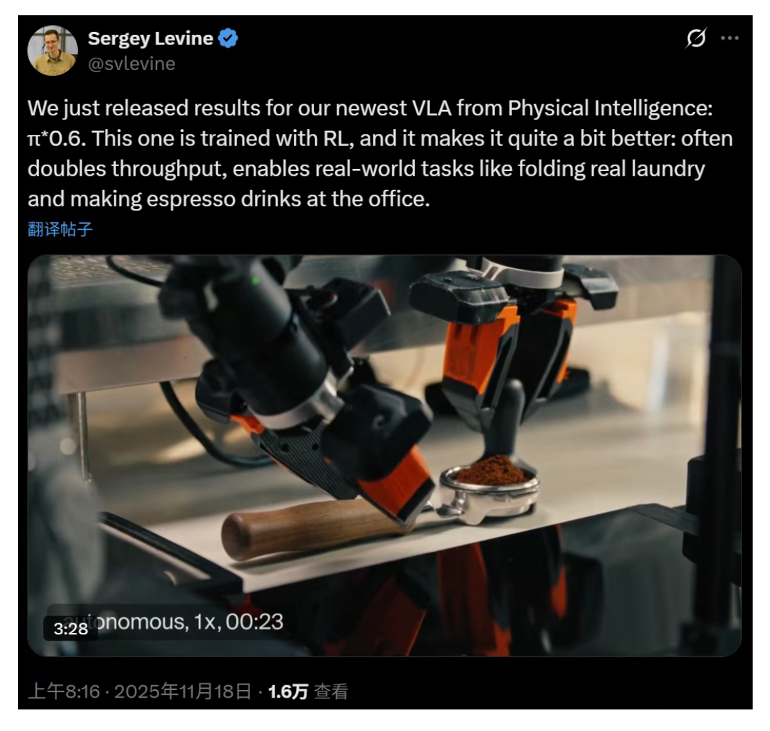 美国具身智能创业公司Physical Intelligence(简称PI)发布了最新机器人基础模型π0.6。PI强调「视觉 – 语言 – 动作」(VLA)模型,通过大规模机器人感知与动作数据训练,使机器人能在未知环境中灵活执行任务。此次发布的π0.6模型,采用Recap(基于优势条件策略的经验与纠错强化学习)方法进行训练,包括模仿学习、纠正式指导和强化学习三个步骤,解决了以往仅靠模仿学习难以持续成功的问题。该模型在制作意式咖啡、折叠衣物和组装纸箱等真实世界任务中表现出色,成功率和吞吐量大幅提升,例如制作意式咖啡的成功率和吞吐量提升了两倍以上,且能连续稳定运行完成任务,为具身智能的发展带来了新的突破。来源:微信公众号【机器之心】