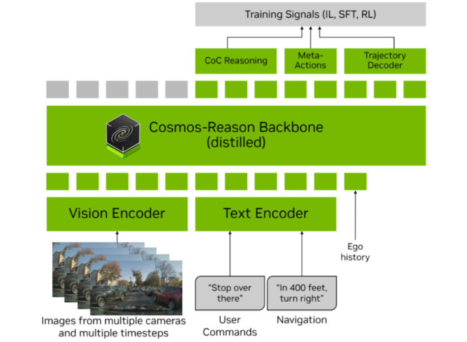 - 推理核心:基于Cosmos-Reason模型,通过自回归生成结构化因果推理文本(如“因行人横穿,需减速”)。