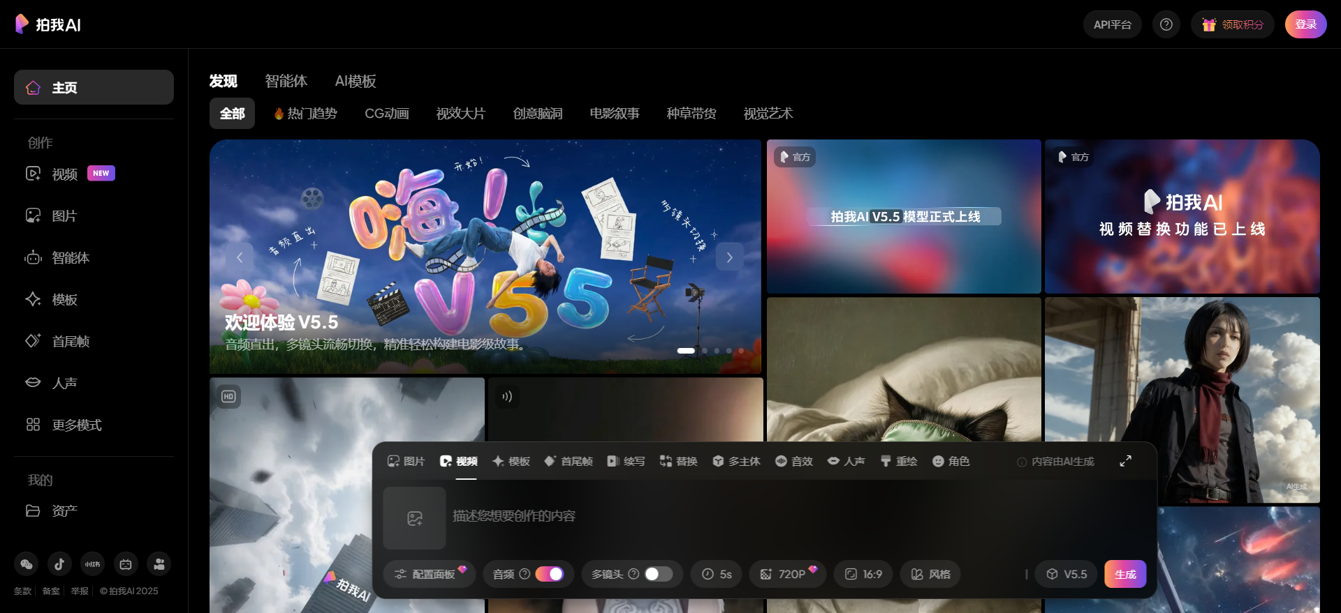 - 模板创作:使用Agent创作助手,选择模板(如“巨大宠物和小小人”)并上传图片,自动生成5-30秒短片。