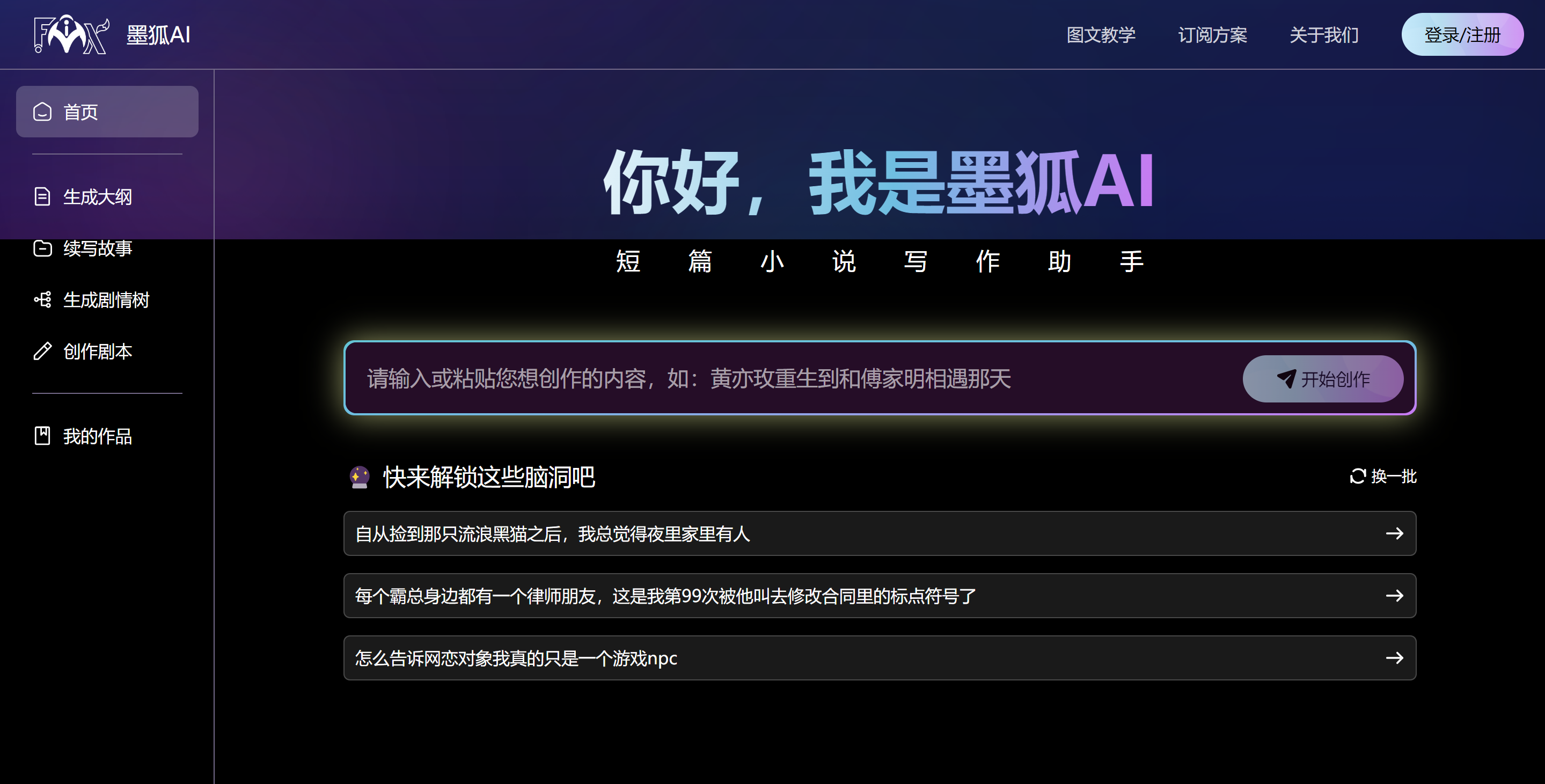 墨狐AI是一款专注于为网文小说作者提效的创作工具,提供生成大纲、续写故事、生成剧情树、创作剧本等功能,中文创作能力超越 gpt!墨狐能为网文作者解决创作过程中遇到的难题,如开书难、卡文等。 这款AI助手通过其功能,大大缩短了从片段创意到生成故事的时间,使得文学创作变得更加高效和便捷,让文学梦触手可及。