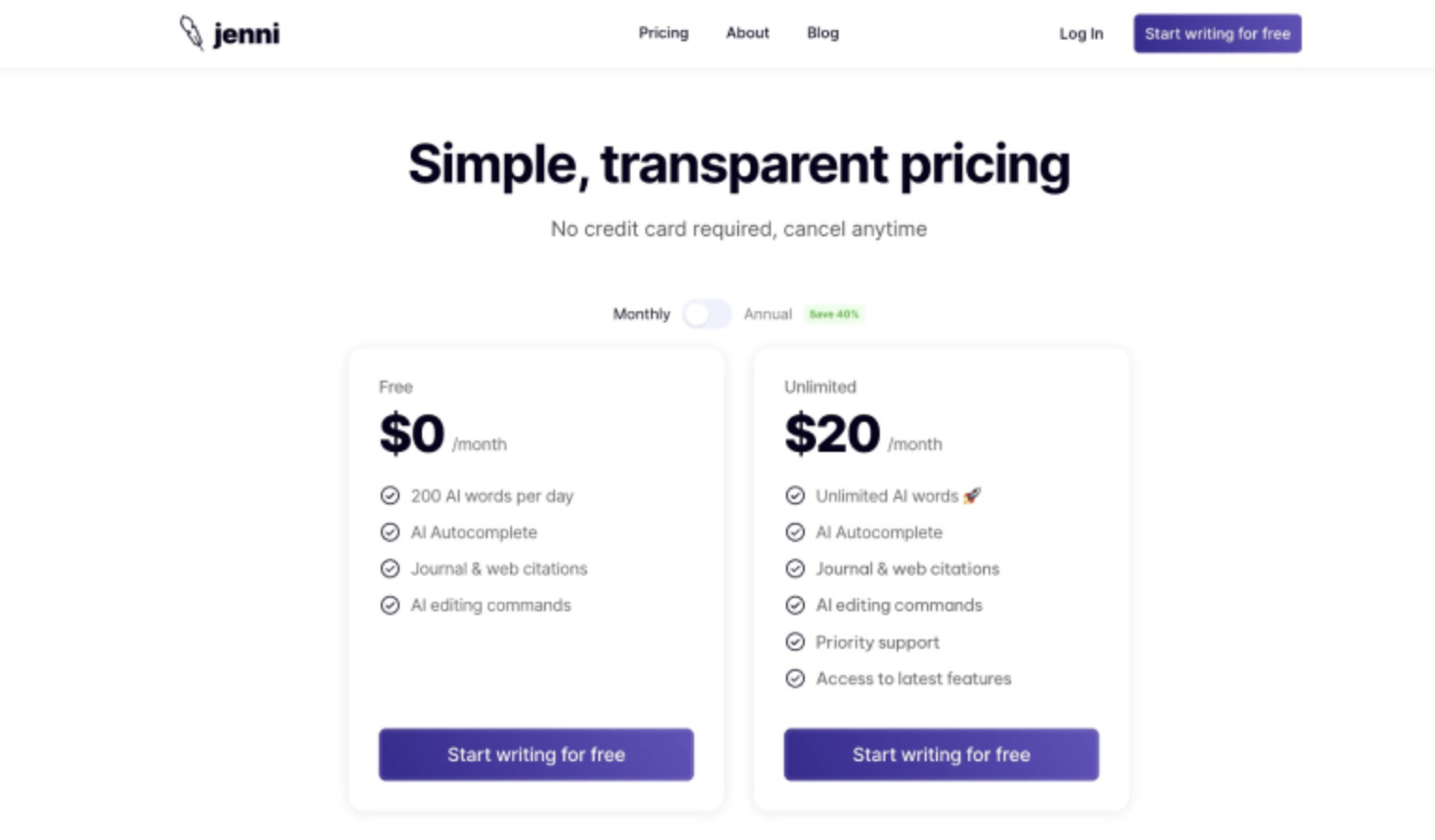 Jenni Al 目前主要提供两种定价计划,一个是Free免费版本,一个是Unlimited付费版本: