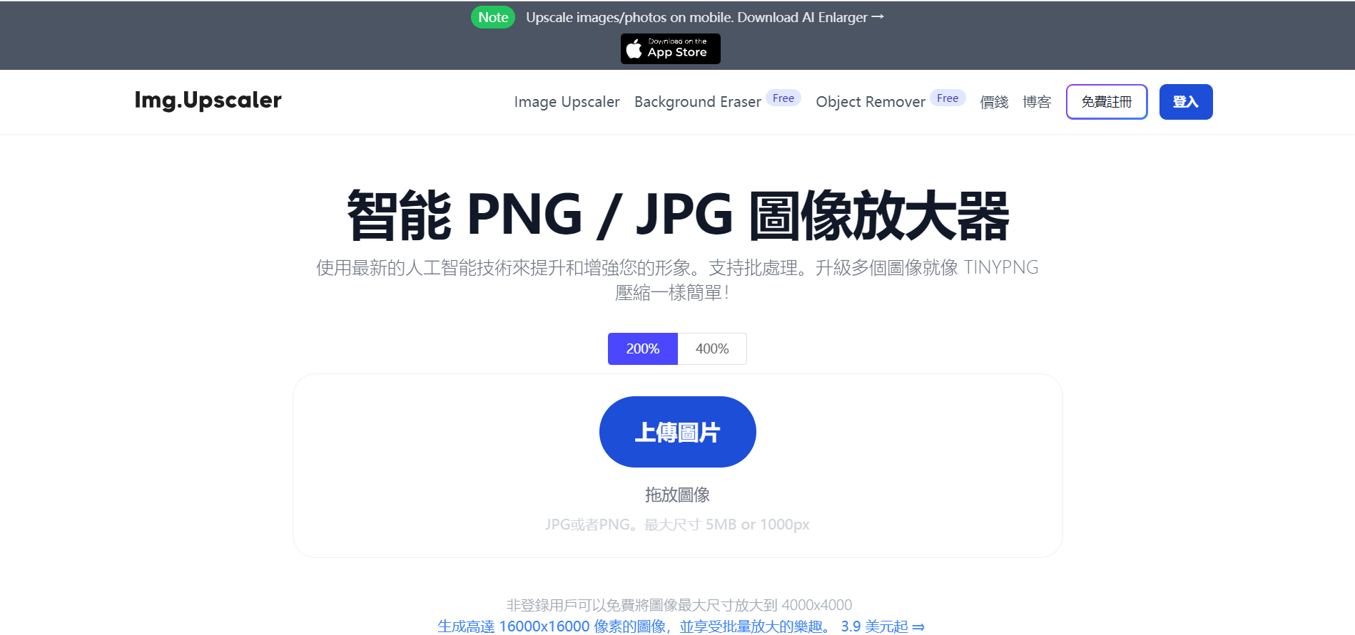 智能 PNG / JPG 图像放大器 使用最新的人工智能技术来提升和增强您的形象。支持批处理。升级多个图像就像 TINYPNG 压缩一样简单!