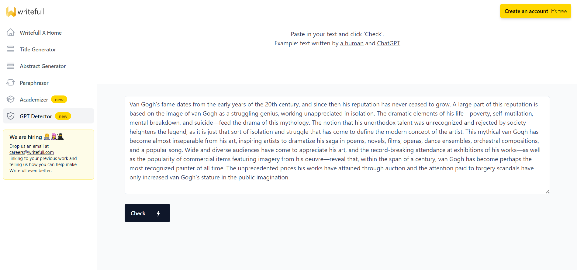 查看文本是否来自 GPT-3、GPT-4 或 ChatGPT。不确定文本是原创还是AI抄袭? 在这里检查一下! 粘贴您的文本并单击“检查”。