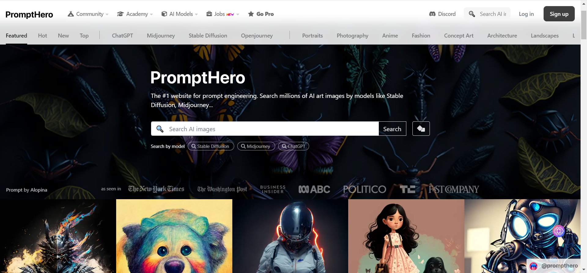 PromptHero可通过 Stable Diffusion、Midjourney 等模型搜索数百万张 AI 艺术图像…