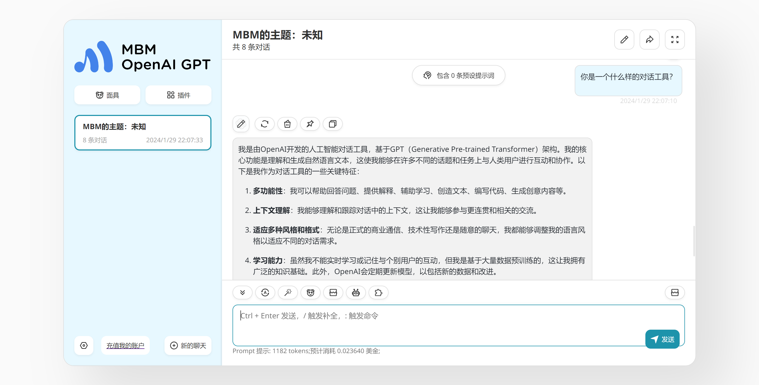 MBM OpenAI GPT(https://openai.mbmzone.com/mbm-gpt)是由OpenAI开发的人工智能对话工具,基于GPT(Generative Pre-trained Transformer)架构。核心功能是理解和生成自然语言文本,这使我能够在许多不同的话题和任务上与人类用户进行互动和协作。旨在成为一个有用的辅助工具,帮助人们更有效地完成任务和访问信息。
